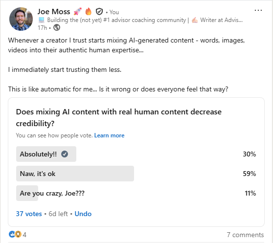 Using AI to create content to use in outbound cold prospecting via email, LinkedIn DMs, AI voicemails, cards written by robots… is one of the worst marketing methods out there.