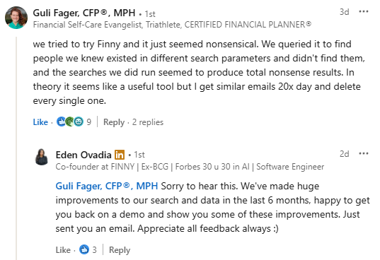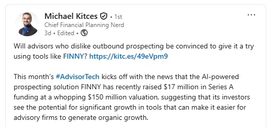 FINNY isn’t proven yet, their churn is high from what I’ve heard, they’re actively trying to pivot to prospecting that actually works… but also… they’re just way overpriced… There are much better data tools, even a full-blown CRM with prospecting built in that is only $150 per month while FINNY is $500/mo.