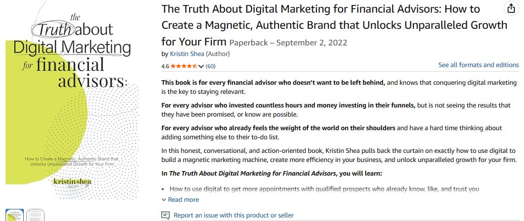 $17.95 - A truly fantastic book all about not using templated content is this one: The Truth About Digital Marketing for Financial Advisors: How to Create a Magnetic, Authentic Brand that Unlocks Unparalleled Growth for Your Firm by Kristin Shea