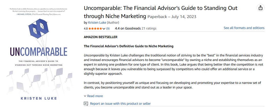 $17.30 - Uncomparable: The Financial Advisor’s Guide to Standing Out through Niche Marketing by Kristen Luke