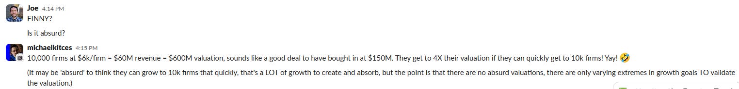 (It may be ‘absurd’ to think they can grow to 10k firms that quickly, that’s a LOT of growth to create and absorb, but the point is that there are no absurd valuations, there are only varying extremes in growth goals TO validate the valuation.)”