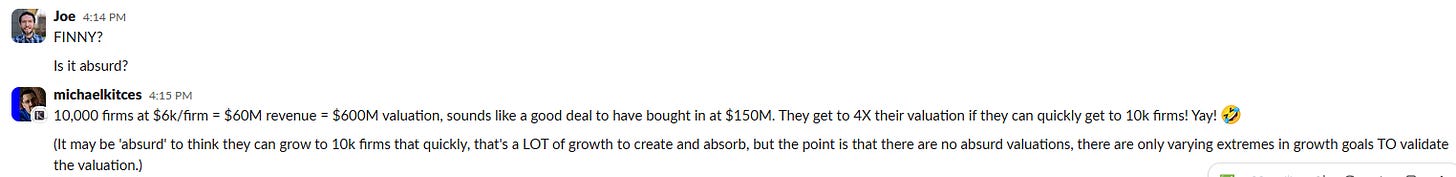 Michael: “10,000 firms at $6k/firm = $60M revenue = $600M valuation, sounds like a good deal to have bought in at $150M. They get to 4X their valuation if they can quickly get to 10k firms! Yay! 🤣