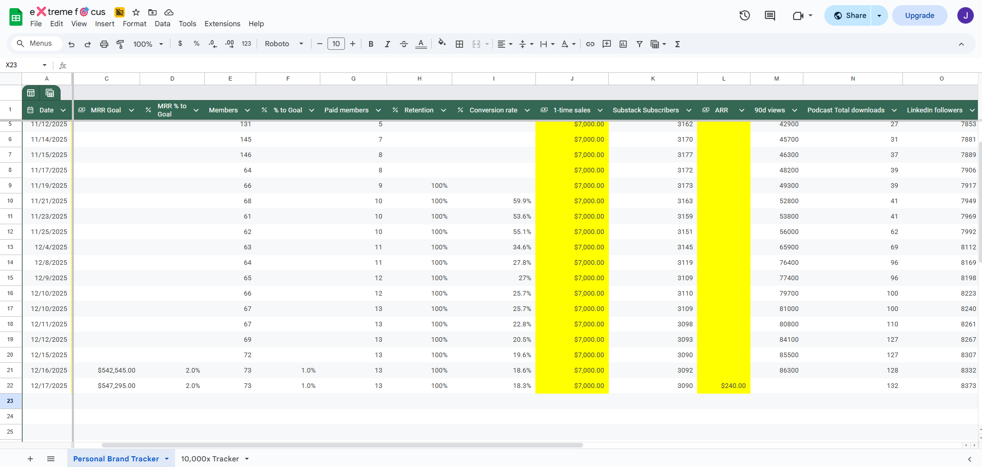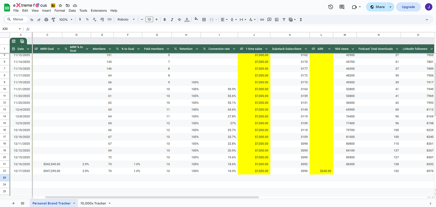 If you want to find success in 2025, 2026, life, etc… it comes down to a few things. I was talking with SEO expert Bill Widmer and asked him just this. Here’s what he said: “Just fucking care about people. And 2nd, track progress…” His words, not mine. I think my mantra of “Do work that serves others” is how I’m executing on the first thing. Tracking progress is something I started not too long ago. I’m calling it a “Personal Brand Tracker”: Erica Pauley calls it “Tracking Your Trek.”