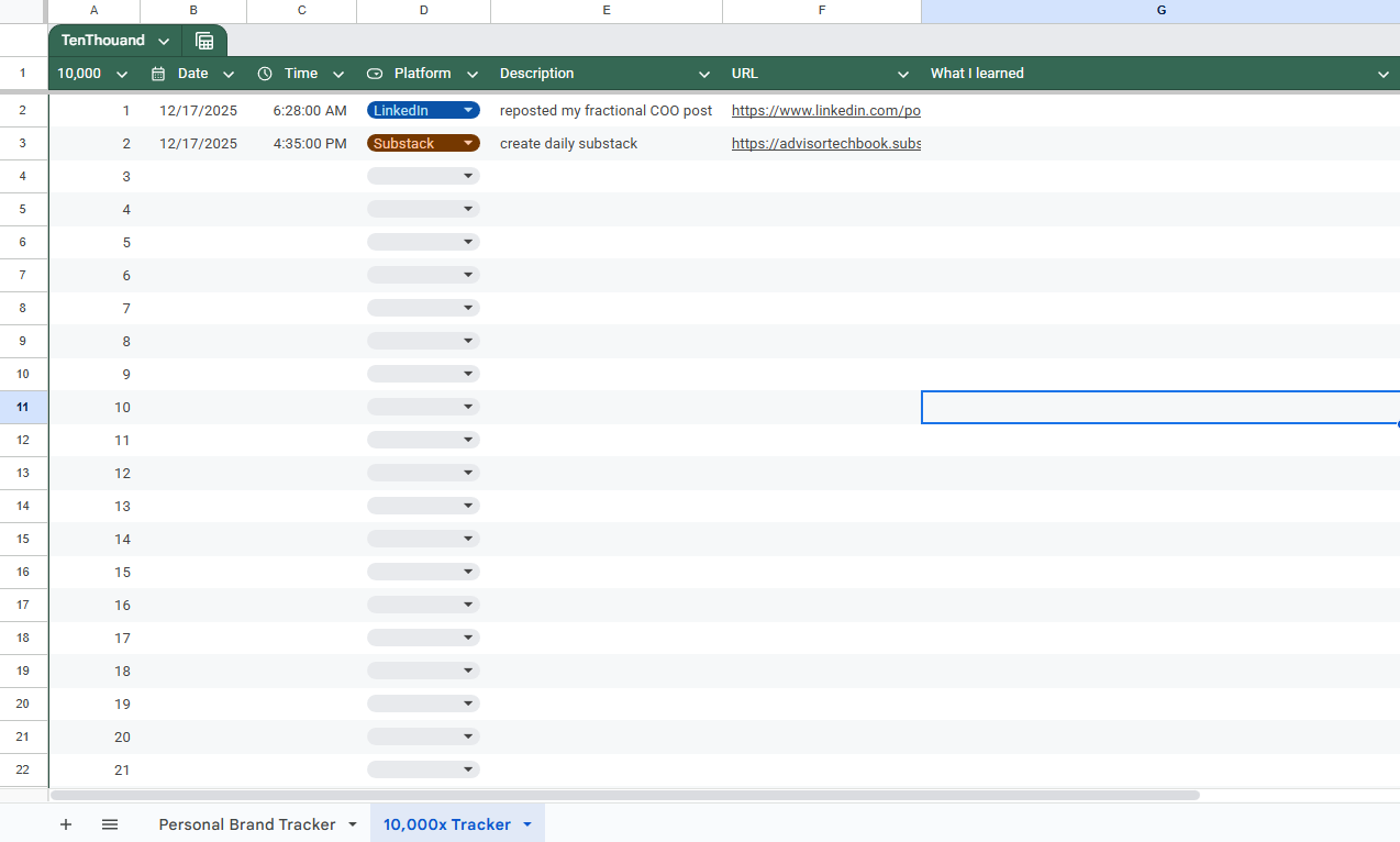 But now let’s take a look at the 2nd tab: “the 10,000x tracker” If you want to build a personal brand, you’re gonna have to pump content. Human content. Non-consensus content. Content you wrote with your brain and your fingers… and for that, we need volume and we need a tracker… hence the 10,000x pieces of content tracker. I’ve already got 10,000 rows ready to go, now I just need 10,000 contents.